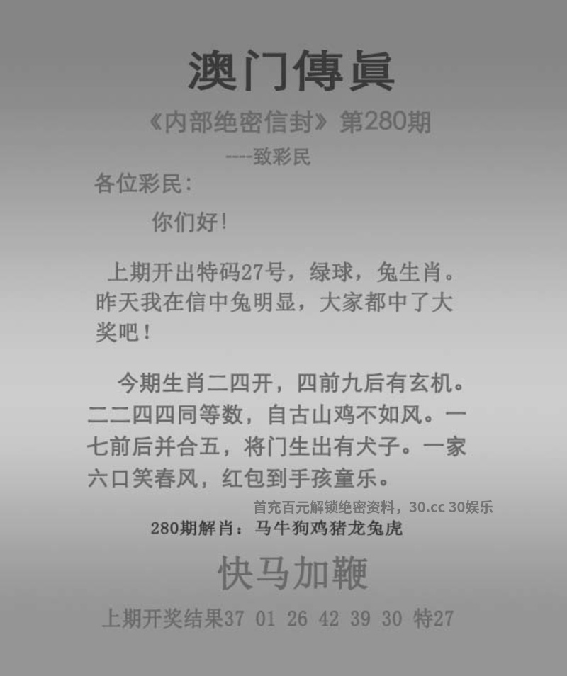 278期:独解传真 解:今期生肖二四开,二字来头七相送。一字一句要留意,看好红波在今期。十二生肖个个知,六合在前取投机。二七得三六相加,大王去找美人码。 送:马龙虎鸡蛇猪羊兔 抓住一句解必中特 |
